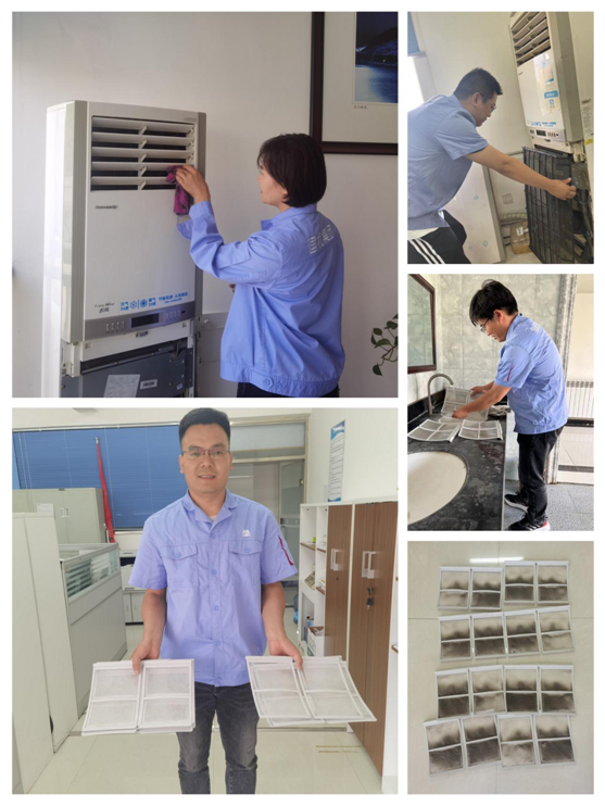 在活動現(xiàn)場,志愿者們分工明確,配合密切,拆卸空調(diào)外殼、清洗空調(diào)濾網(wǎng)、擦拭空調(diào)外機(jī),經(jīng)過一下午有條不紊的清洗活動,辦公室和會議室的空調(diào)從內(nèi)到外煥然一新。“沒想到空調(diào)濾網(wǎng)這么臟”“太好了,終于能放心開空調(diào)了”,看著沖洗出的灰塵污漬,員工們對志愿者助人為樂、無私奉獻(xiàn)的精神紛紛表示感謝和贊揚。