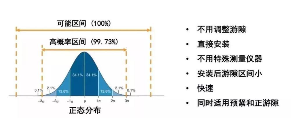Set-Right使用概率方法并控制相關(guān)零件的尺寸公差來確保所有的裝配總成中有99.73%的軸承游隙落在可接受的范圍內(nèi)。這是一組隨機變量組合后的數(shù)學(xué)預(yù)測,變量就是軸承公差和軸、軸承座等安裝組件的公差。